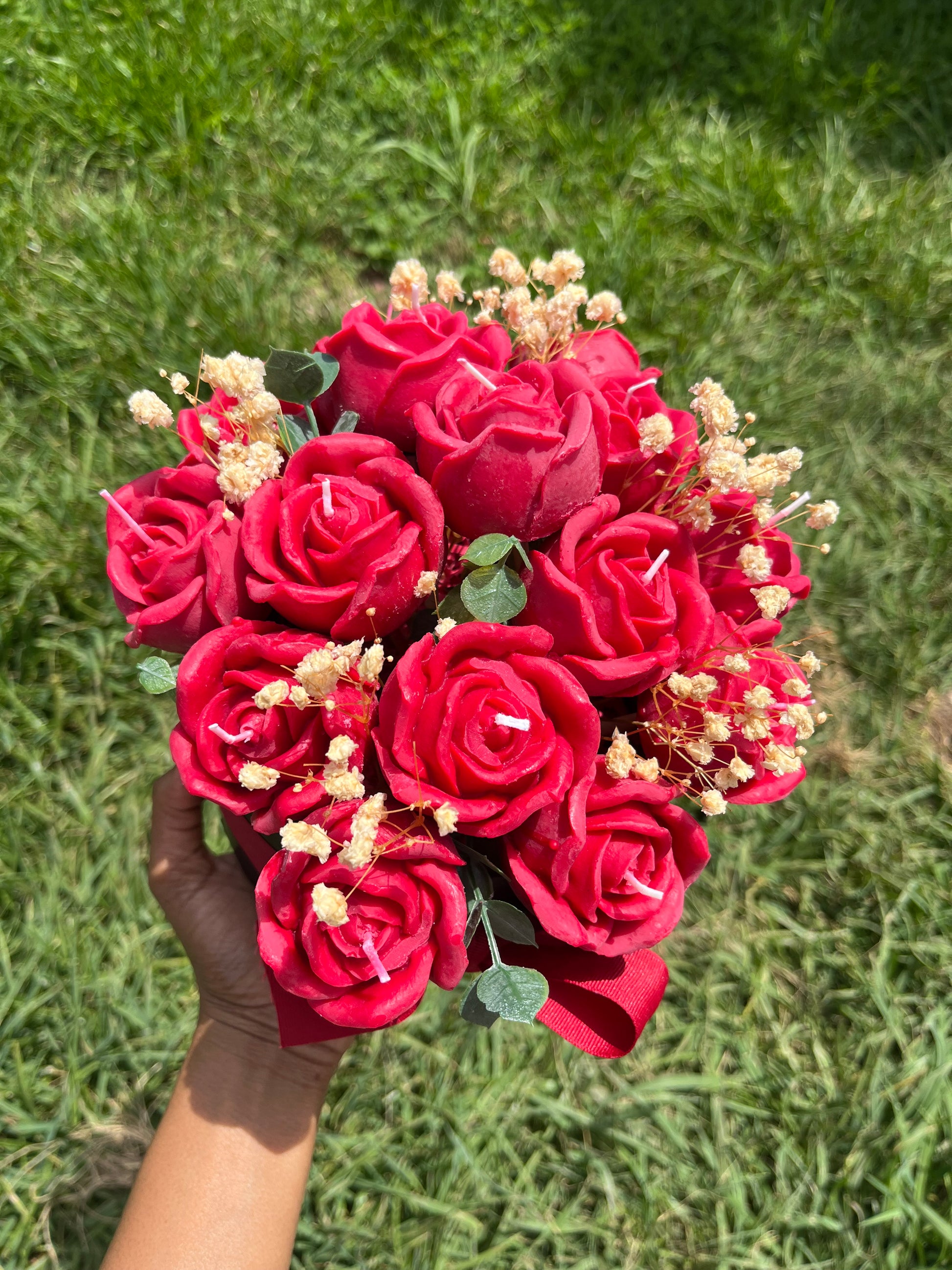 Each candle bouquet is beautifully handcrafted and made to order, featuring delicate molded rose petals with a candle wick (or wickless, if preferred). Available in four sizes: